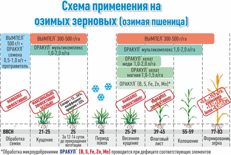 На основании данных, полученных в научных учреждениях и в результате практического использования в производстве, применение препаратов ВЫМПЕЛ® и ОРАКУЛ® в осенний период на озимой пшенице позволяет увеличить содержание сахаров в растениях до 26%. Это, в свою очередь, позволит избежать вымерзания в зимний период. При этом также увеличивается коэффициент кущения до 33%, что, в конечном счете, уже обеспечит прибавку к урожаю от 5,6 ц/га и выше.